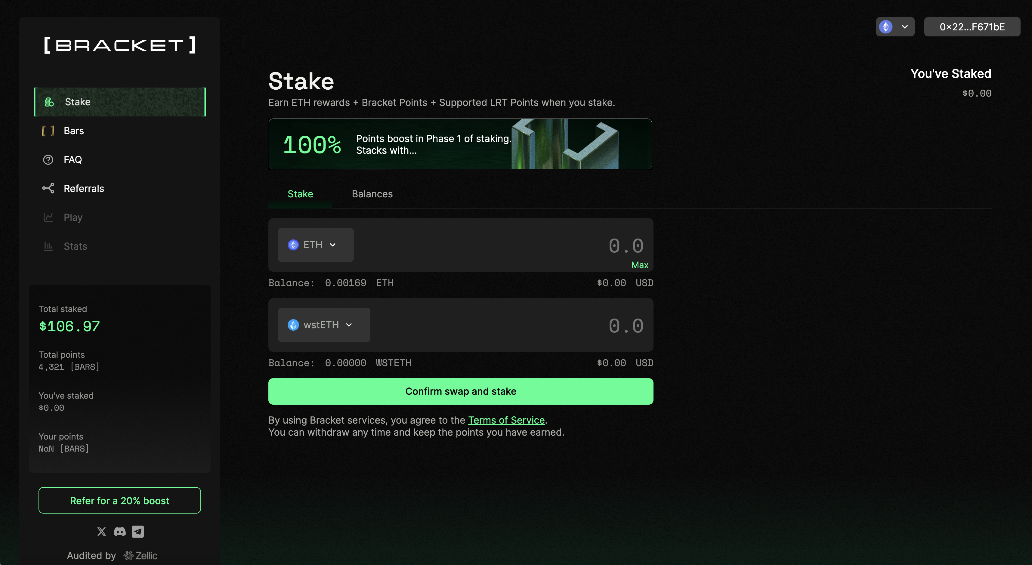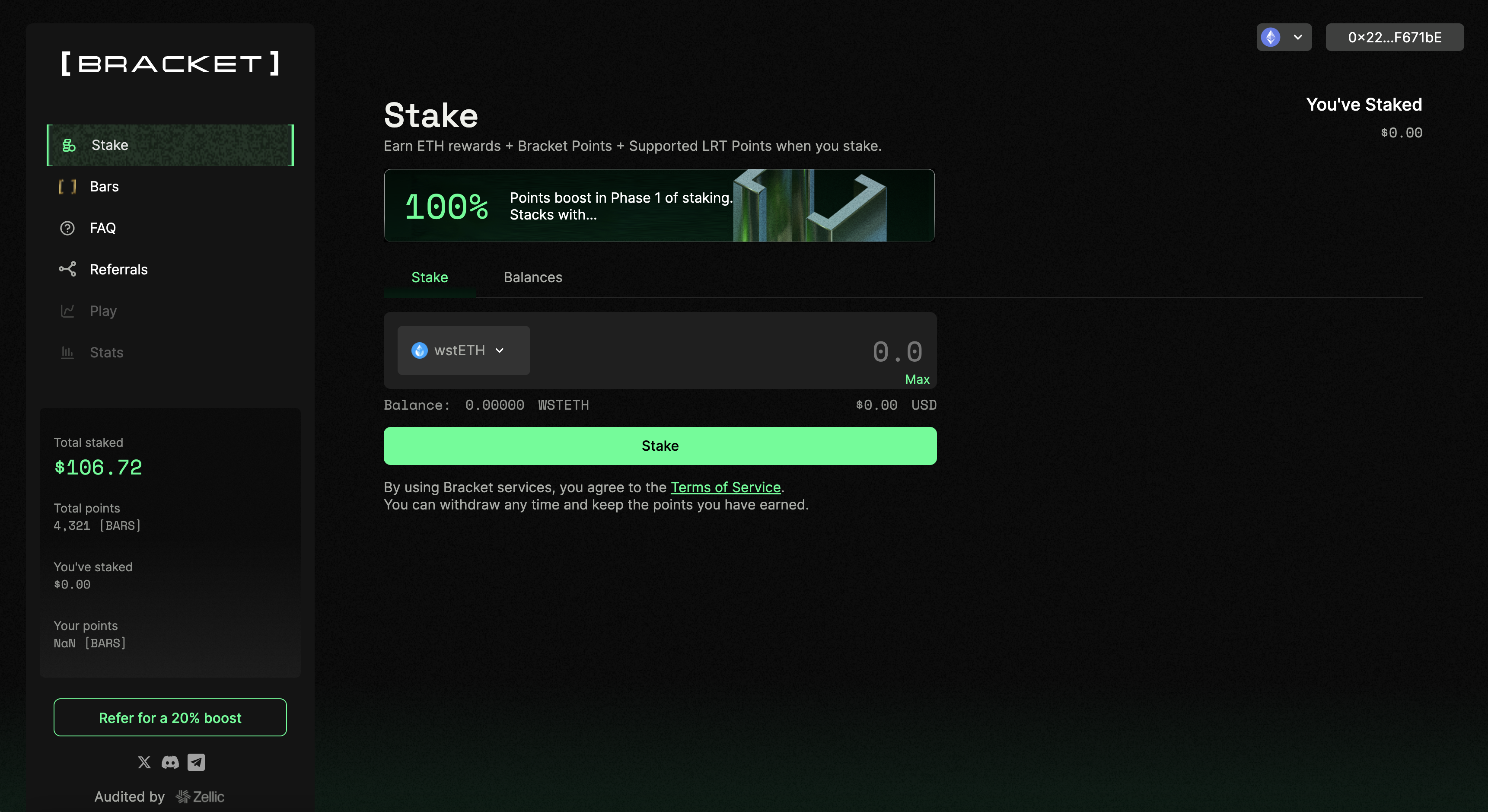 To view your points, simply go to the "\[BARS]" page and review the leaderboard.  **The \[BARS] calculation is on a 24hrs schedule so please be patient after staking to see your \[BARS] balance.** \ <br>