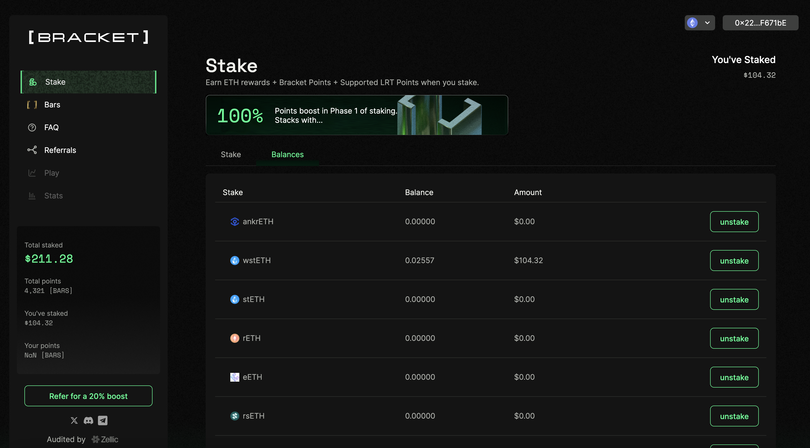 **Bracket staking allows unstaking at anytime prior to Phase II.** To withdraw, navigate to the stake page, select the "Balances" tab, and then enter the amount you'd like to unstake. You will be prompted with a transaction confirmation in your wallet. \ <br>